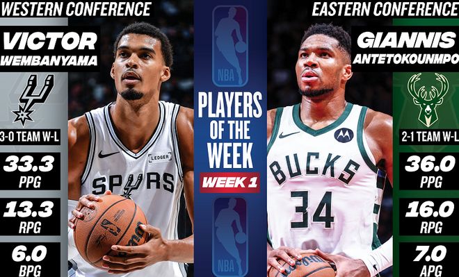 NBA官方公布了第1周的东西部周最佳球员,东部由雄鹿前锋字母哥当选,西部由马刺中锋文班亚马当选。字母哥上周场均爆砍36分+16篮板+7助攻+1盖帽的豪华数据,带领雄鹿取得2胜1负的战绩。据统计,字母哥是NBA历史上首位在赛季前3战至少砍下100分+40篮板+15助攻的球员。同时,这是字母哥生涯第28次拿到周最佳,排在队史第1位。文班亚马上周场均豪取33.3分+13.3篮板+2.3助攻+1.7抢断+6盖帽的豪华数据,带领马刺取得3胜0负的战绩。据统计,文班亚马是NBA历史上首位赛季前3战至少砍下100分+40篮板+15盖帽的球员。同时,这是文班亚马生涯第2次拿到周最佳。值得一提的是,库里、东契奇、里夫斯、亚历山大、三球、布伦森、小艾、马克西、米切尔、鲍威尔等人获得了周最佳提名。